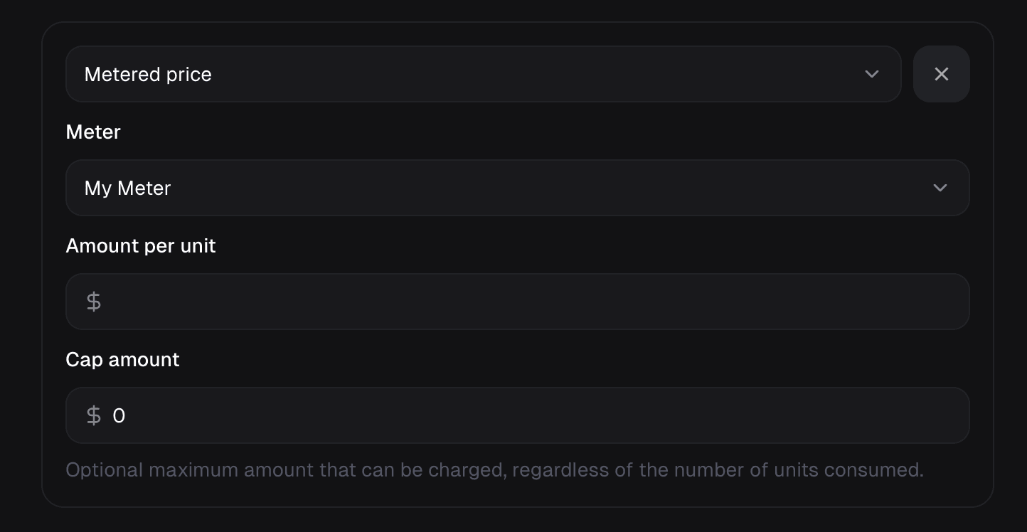 To charge your customers for usage, you need to add a metered price to your product. You’ll need the select the Meter and the amount per unit.